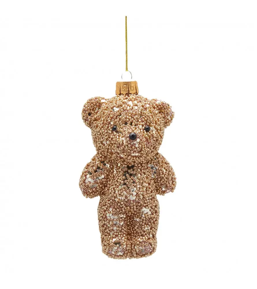 Adorno oso Navidad en dorado con acabado de microperlitas. Mide 15 cm de alto por 8 cm de ancho. Perfecto para árboles elegantes y festivos.