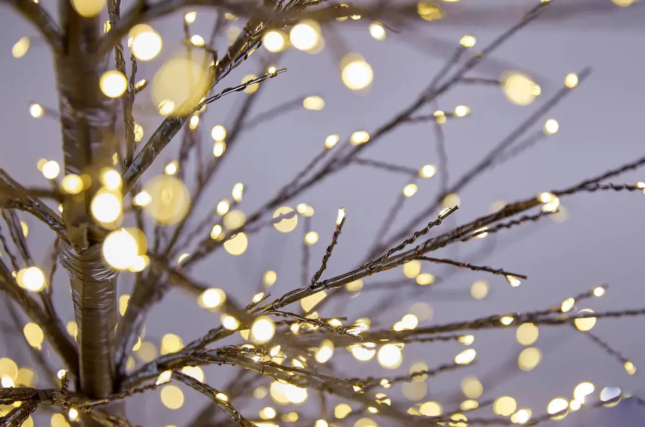 Con 150 cm de altura y un diámetro máximo de 105 cm , este árbol recrea la silueta natural de una haya estilizada, con una estructura metálica realzada por 1440 microLED de luz cálida , fijos y armoniosamente difundidos en todas sus ramas. El resultado es una decoración luminosa de gran refinamiento, perfecta para crear un ambiente acogedor en salones, entradas, salas de exposición, espacios o entornos prestigiosos. El diseño está concebido para un fácil montaje y desmontaje, mientras que la robusta estructura se complementa con detalles de plástico y metal de alta calidad.