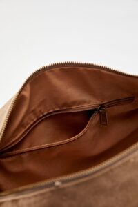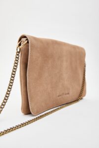 Bolso estilo bandolera. 100% piel. Solapa y cremallera de cierre con logo timbrado. Con forro de algodón. Bolsillo interior con cierre de cremallera. Cadena metálica como asa. Medidas: 15 cm x 22 cm. Asa: 90 cm.