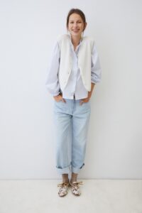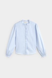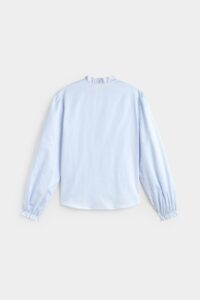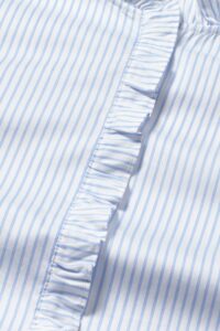 Camisa de rayas 100% algodón BCI. Diseño estampado de rayas. Cuello redondo con volante en mismo tejido. Manga larga con puños elásticos con volantes. Cierre de botones con tapeta con volante en mismo tejido. Fitting recto. Largo prenda para talla S: 60.5 cm.