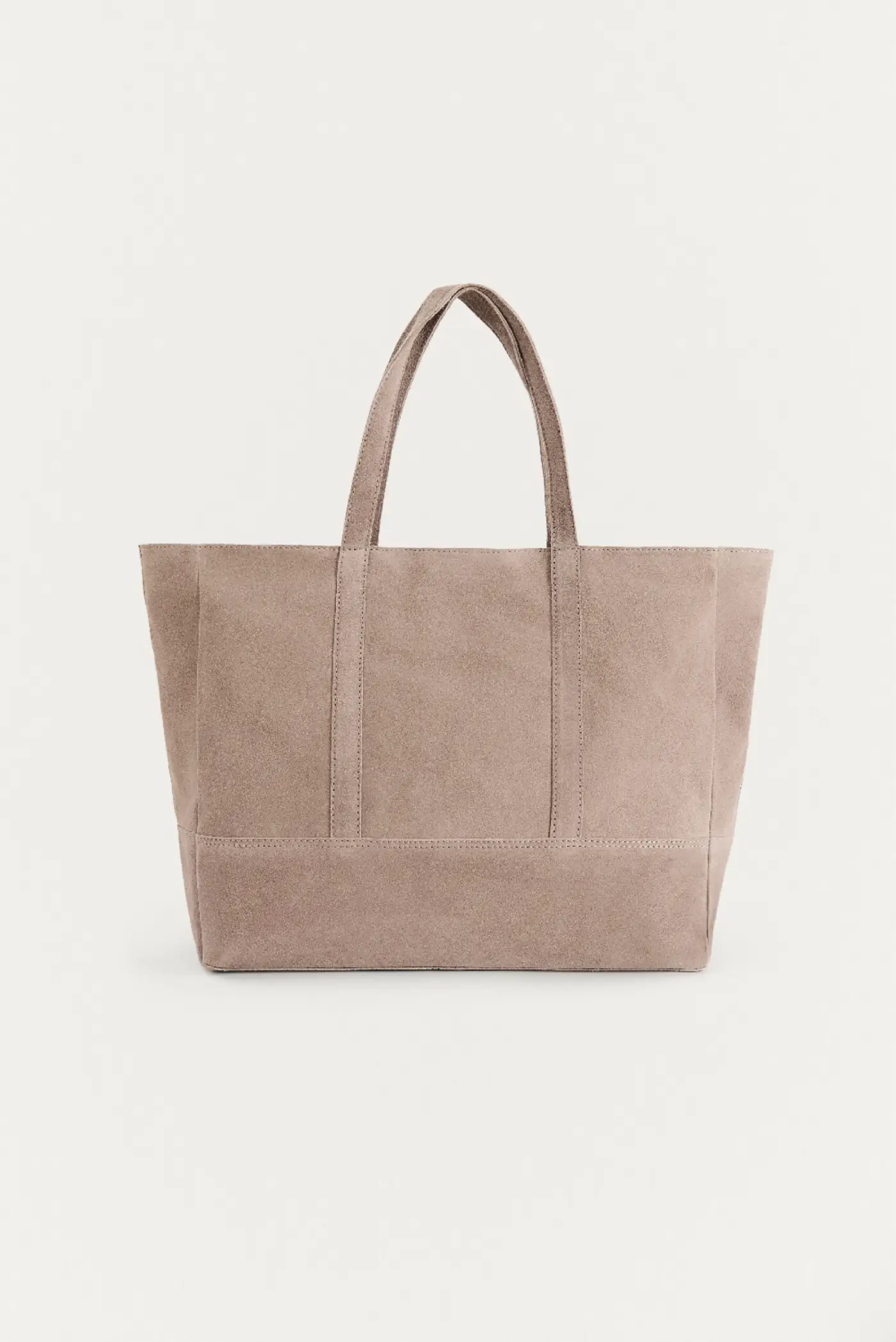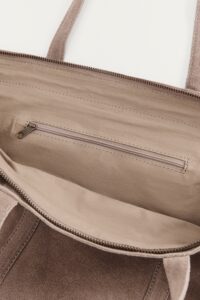 El Bolso Shopper Suede Taupe es amplio, elegante y versátil. Confeccionado en piel serraje 100%, cuenta con doble asa, cierre de cremallera y forro de algodón.