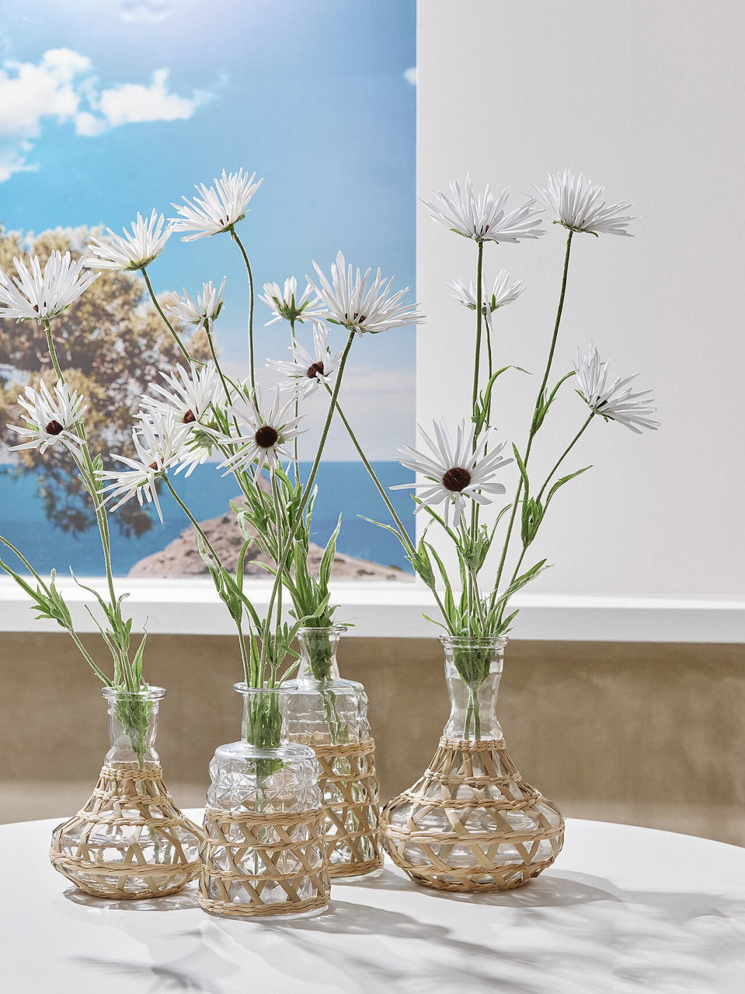 Botella decorativa mimbre de 24 cm. Diseño de cristal y fibras naturales. Perfecta para flores o elemento decorativo.