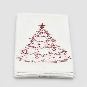 Camino mesa navideño en color crudo con bordado de árbol en tono burdeos. Ideal para decorar con elegancia y sencillez tus comidas festivas.