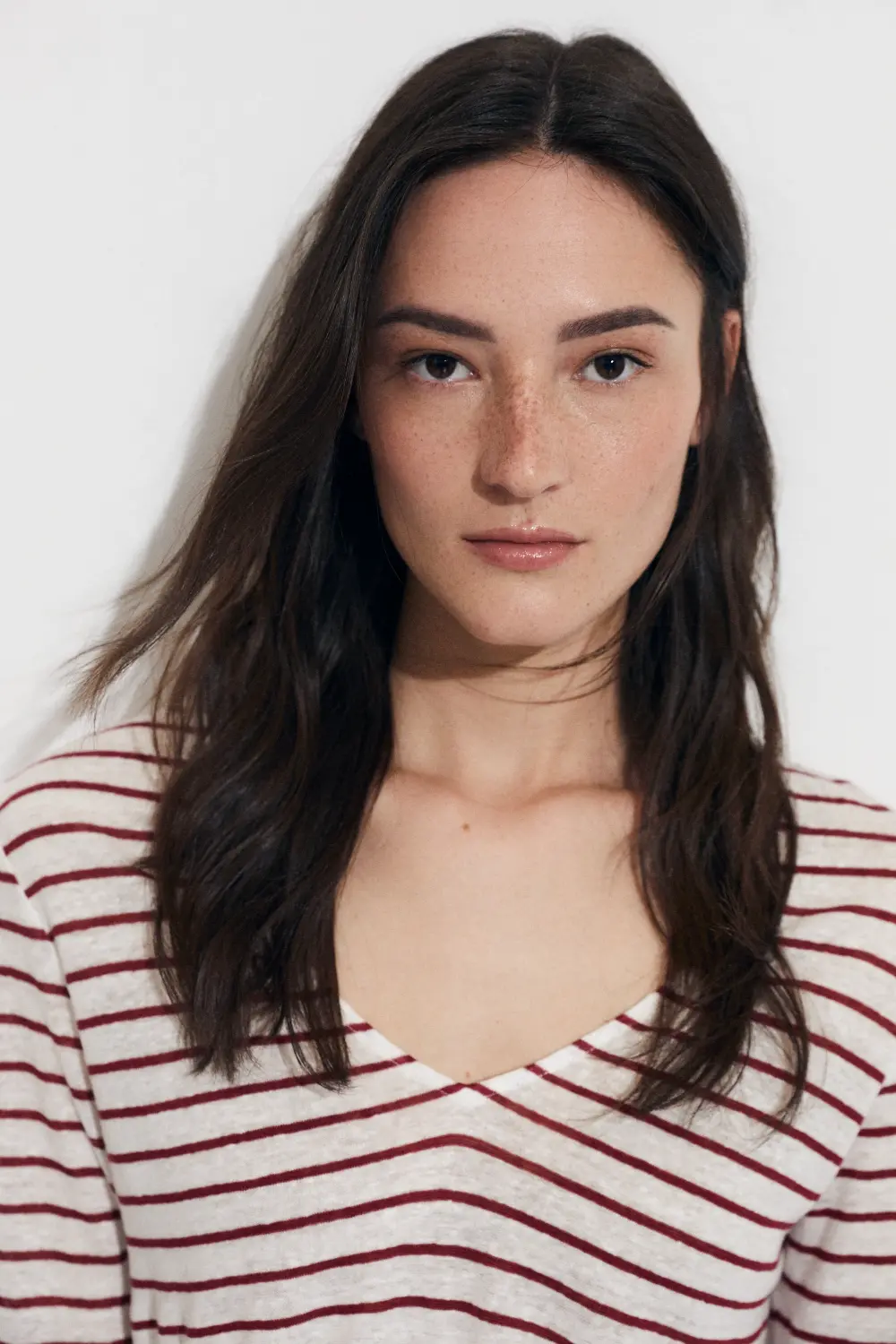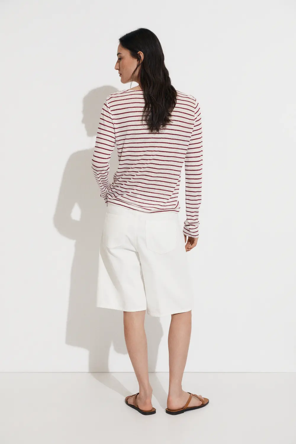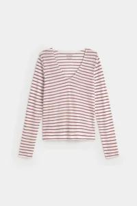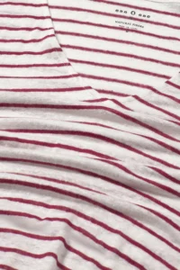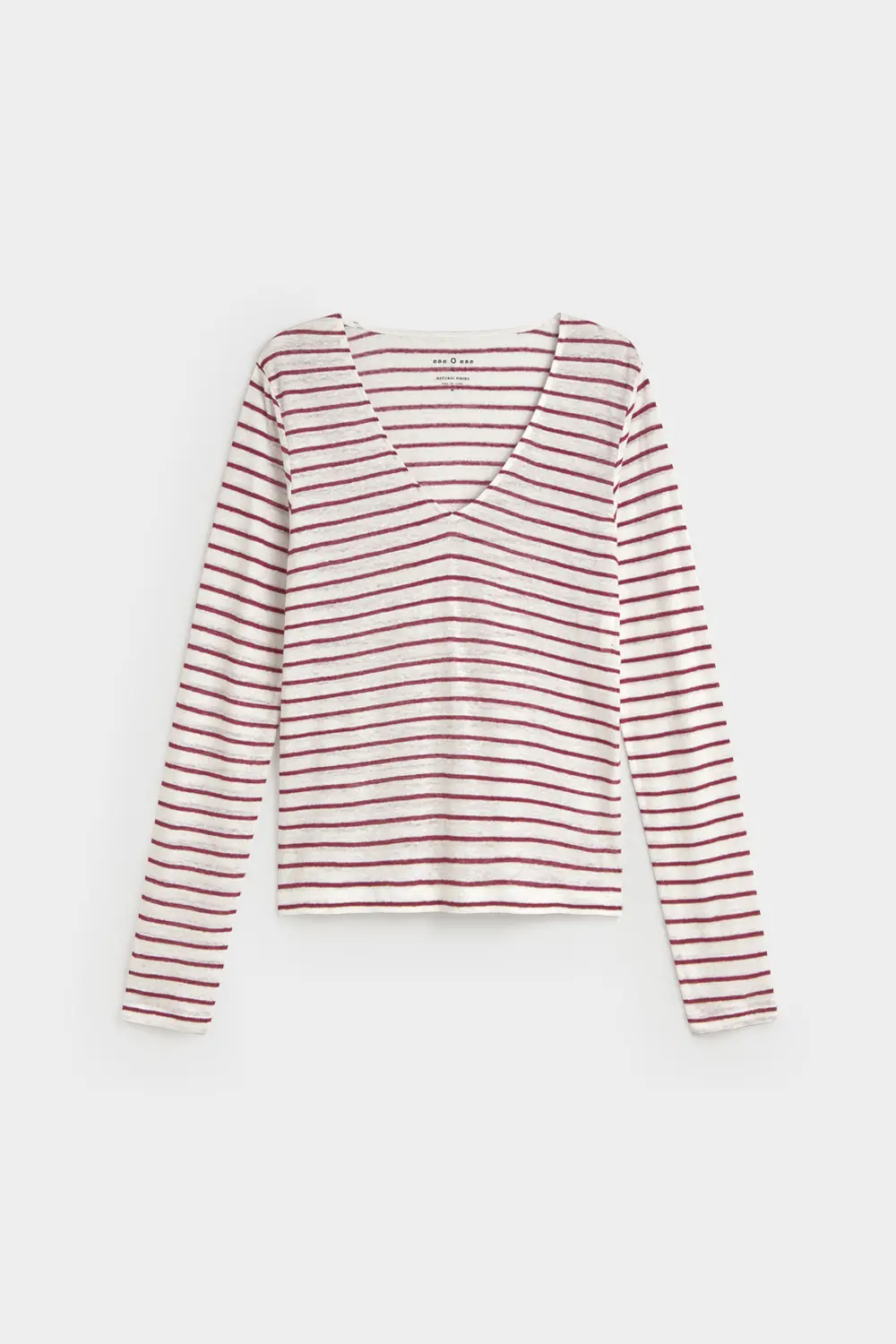 Camiseta de rayas finas en color rojo. Tejido 100% lino. Escote pico. Manga larga. Fitting recto. Largo prenda para talla S: 54 cm.