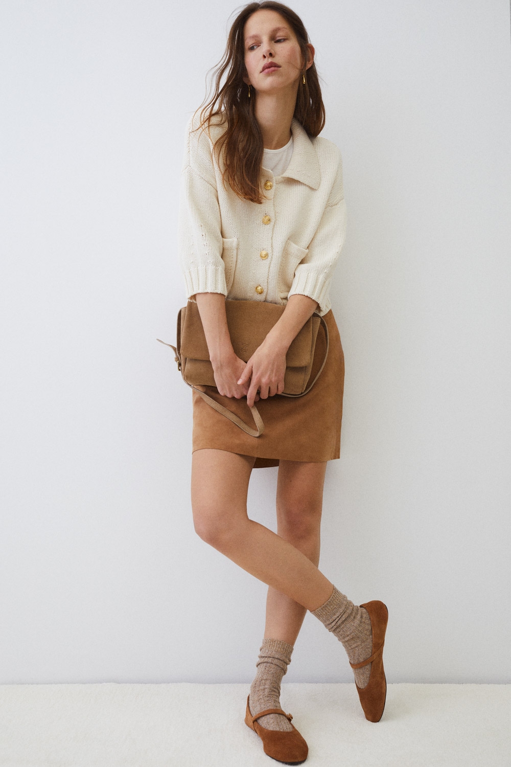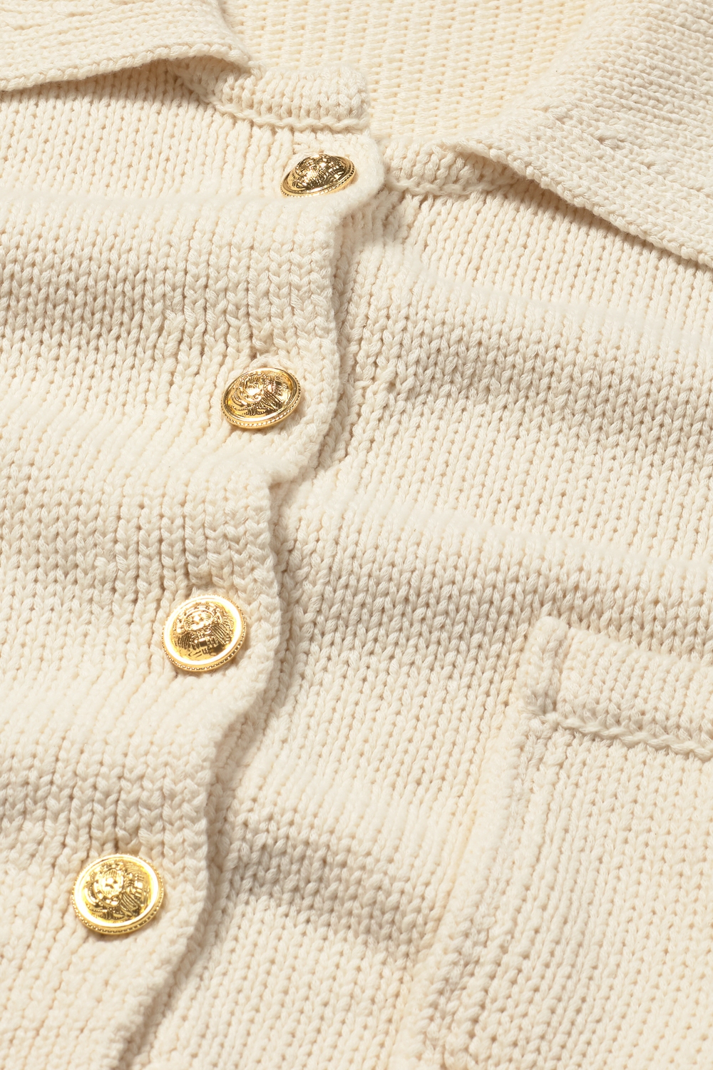 Cárdigan de punto medio fluido crop. Tejido 100% algodón. Cuello polo. Manga francesa. Dos bolsillos de plastrón en la parte delantera. Cierre de botones en color dorado. Fitting crop.
