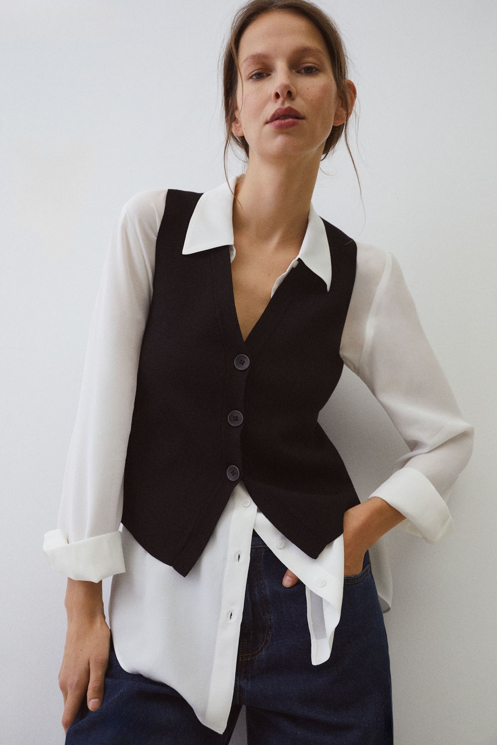 Chaleco de punto. Escote pico. Manga sisa. Cierre con botones a tono en la parte delantera. Fitting recto.