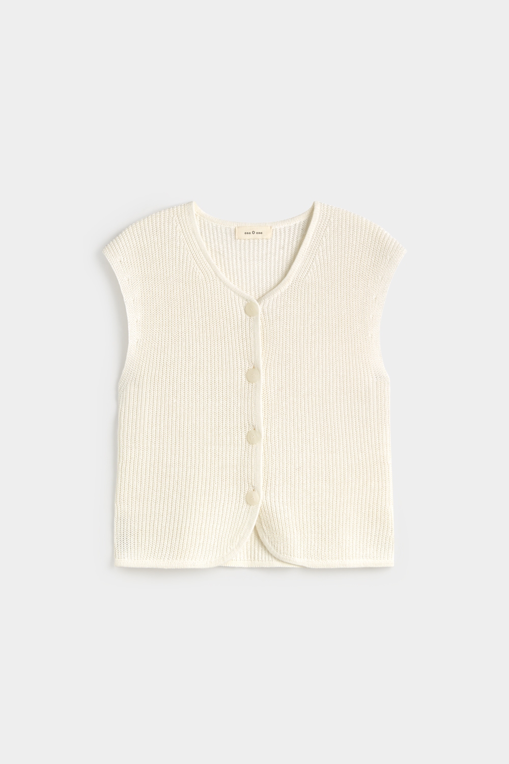 Chaleco de punto medio con estructura de punto perlado. Tejido mezcla algodón, lino y seda. Cuello redondo. Sin mangas. Cierre de botones a tono. Fitting recto. Largo prenda para talla S: 51 cm.