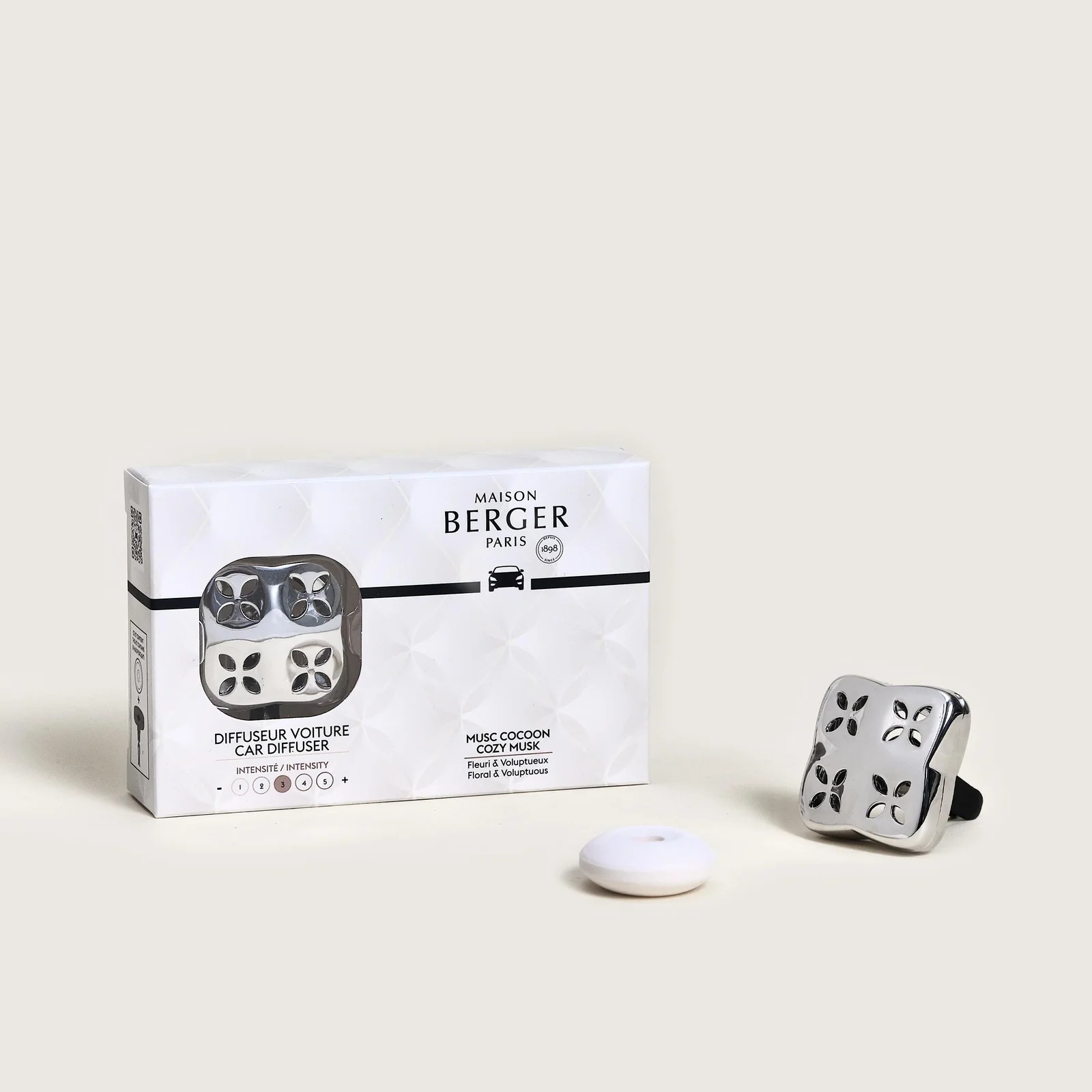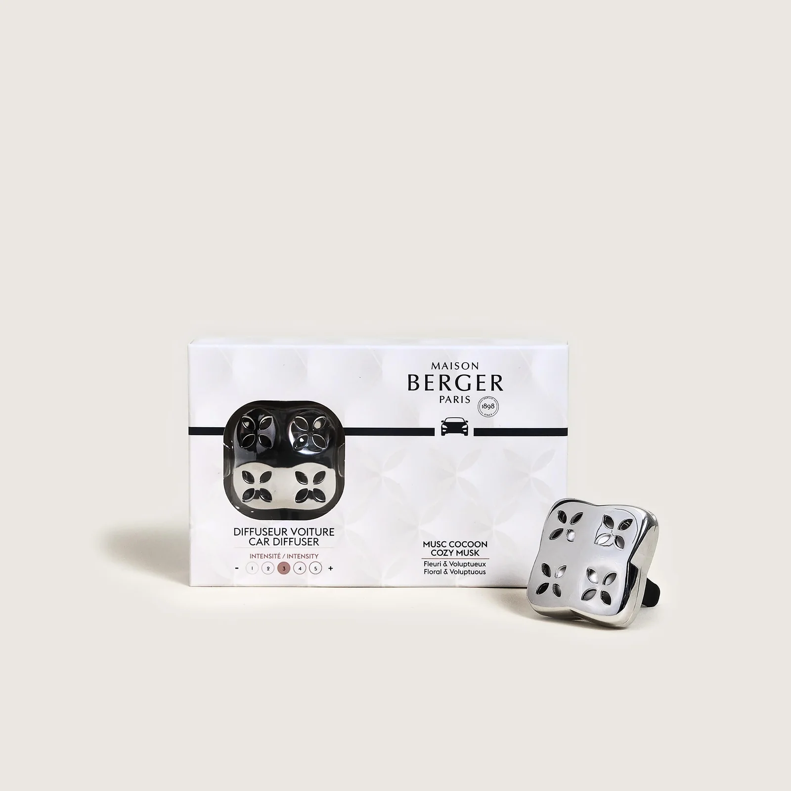 Embárcate en una experiencia olfativa suave y generosa con el Difusor de coche Cosy en color plata. Su diseño envolvente difunde con delicadeza la fragancia Musc Cocoon, transformando cada viaje en un puro instante de bienestar.