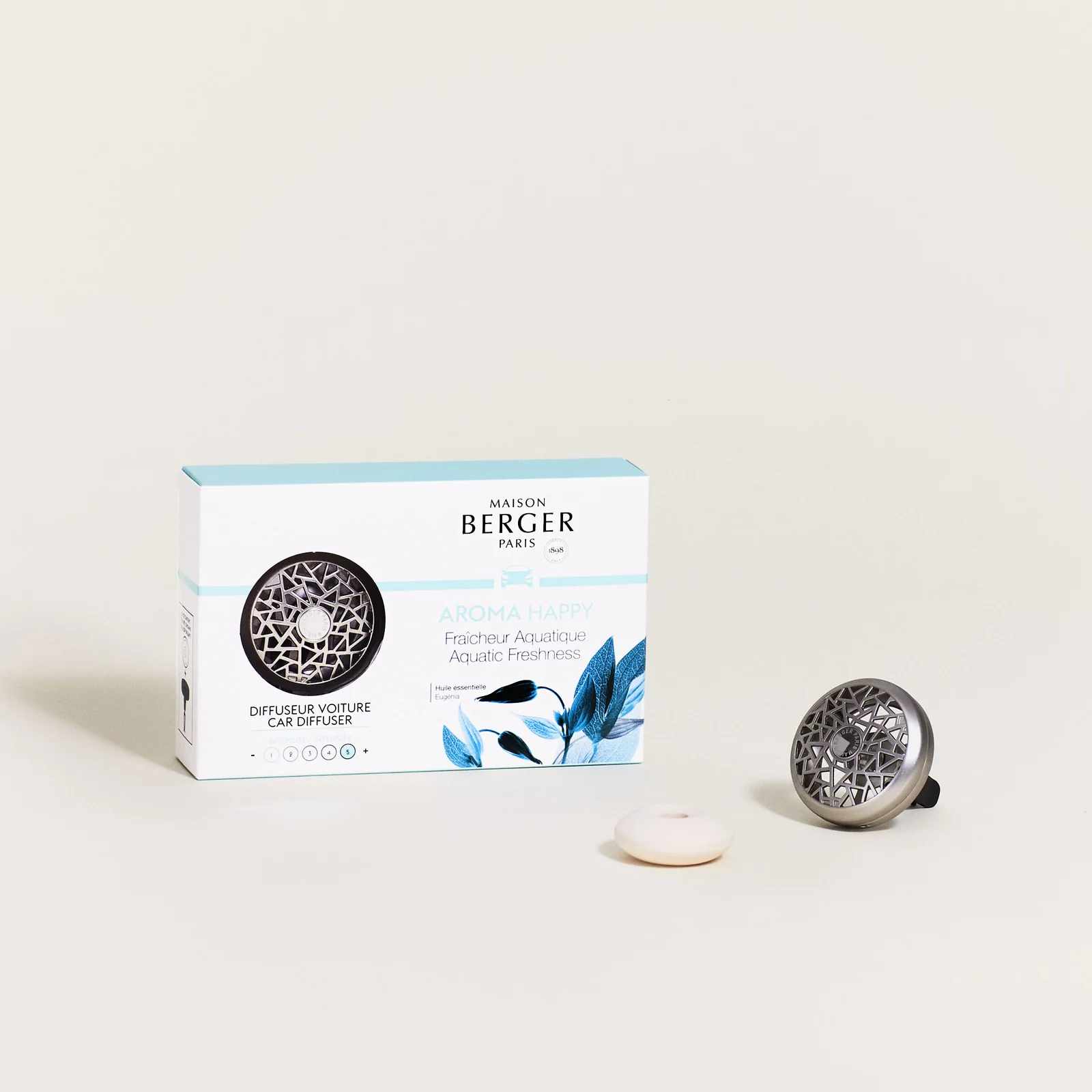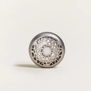Aporta un toque de alegre sofisticación a tu vehículo con el difusor de coche Aroma Happy. Equipado con una recarga de cerámica, difunde de manera continua la vibrante fragancia Happy, ideal para crear un ambiente fresco y revitalizante en el coche. El difusor de coche aroma happy tiene un estilo moderno con un diseño inspirado en las celosías árabes y un acabado en níquel mate.
