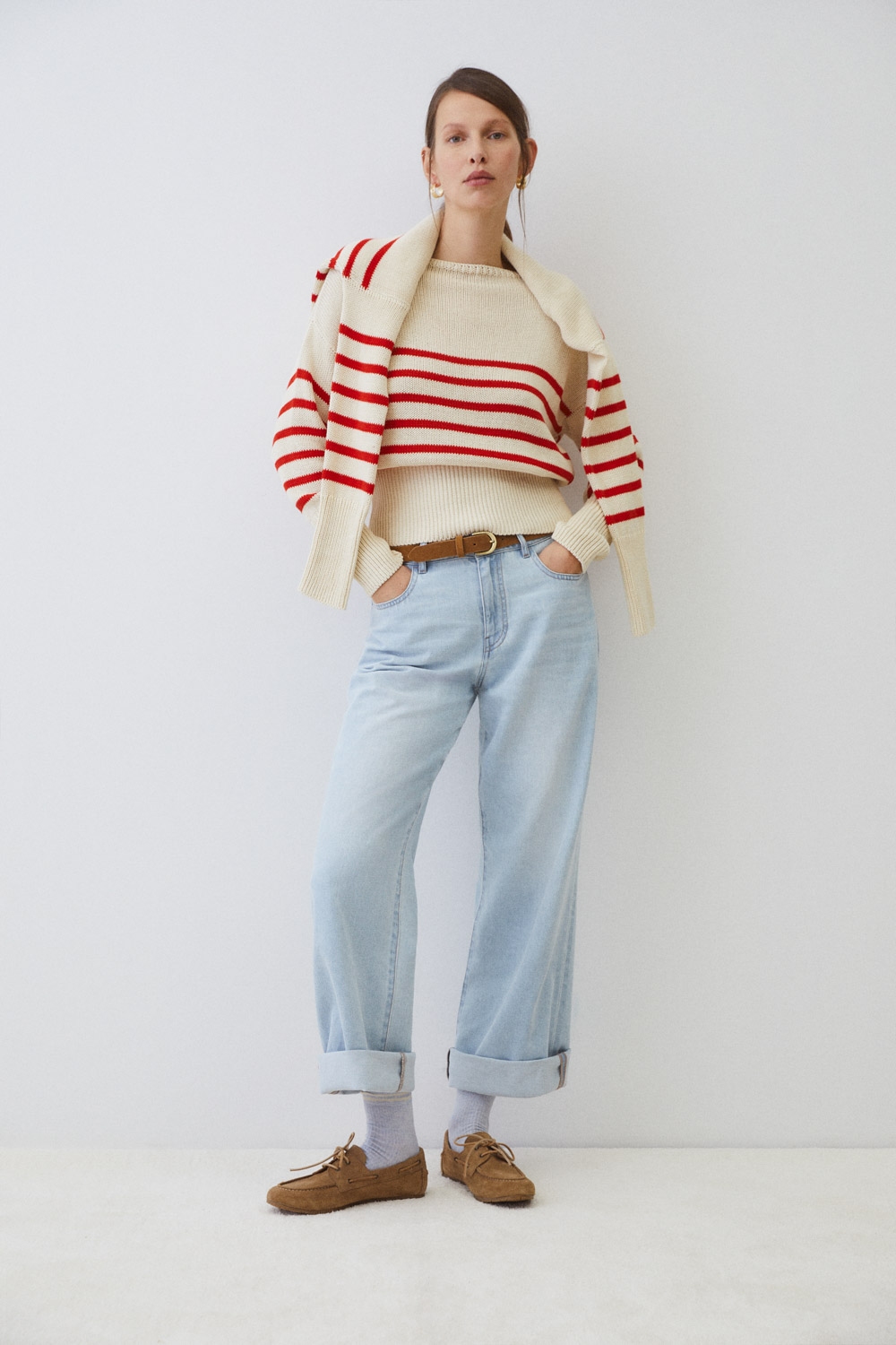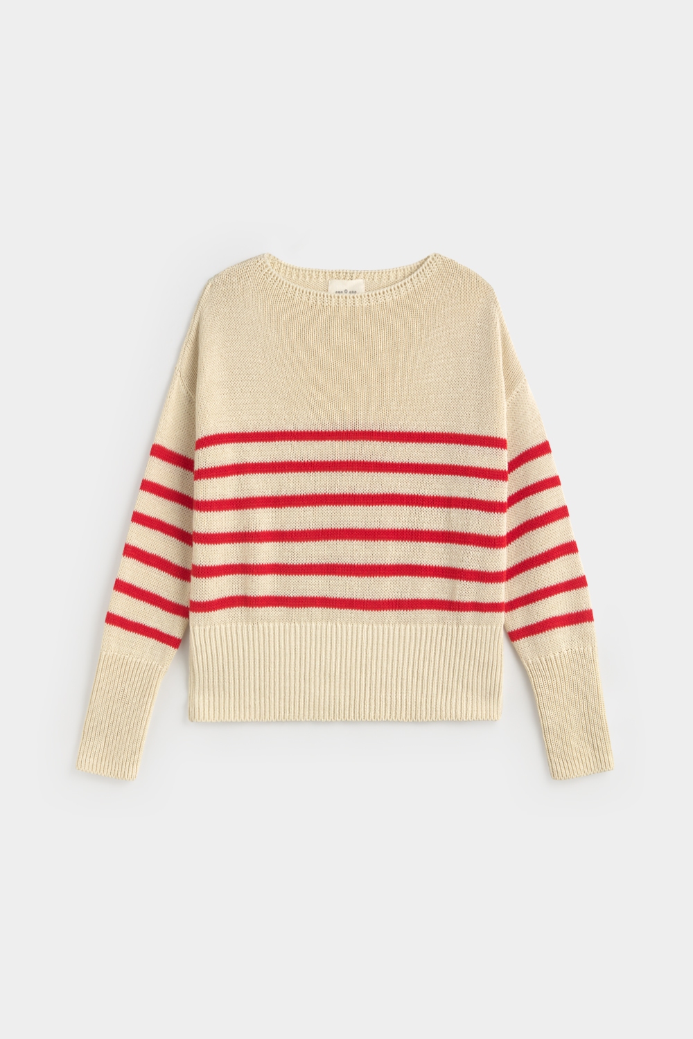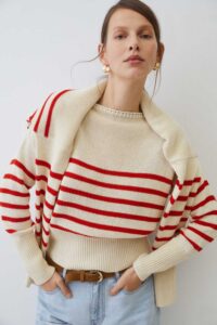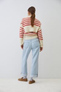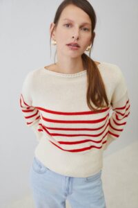 Jersey 100% algodón de punto medio. Diseño estampado de rayas. Cuello redondo. Manga larga. Acabados en rib. Fitting recto.