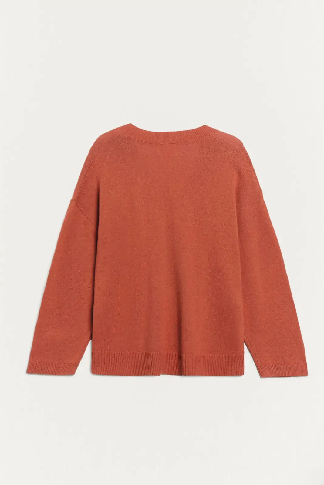 Jersey básico oversize de punto medio. Tejido mezcla algodón y seda. Cuello pico. Manga larga. Acabados de rib. Fitting oversize.