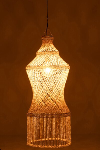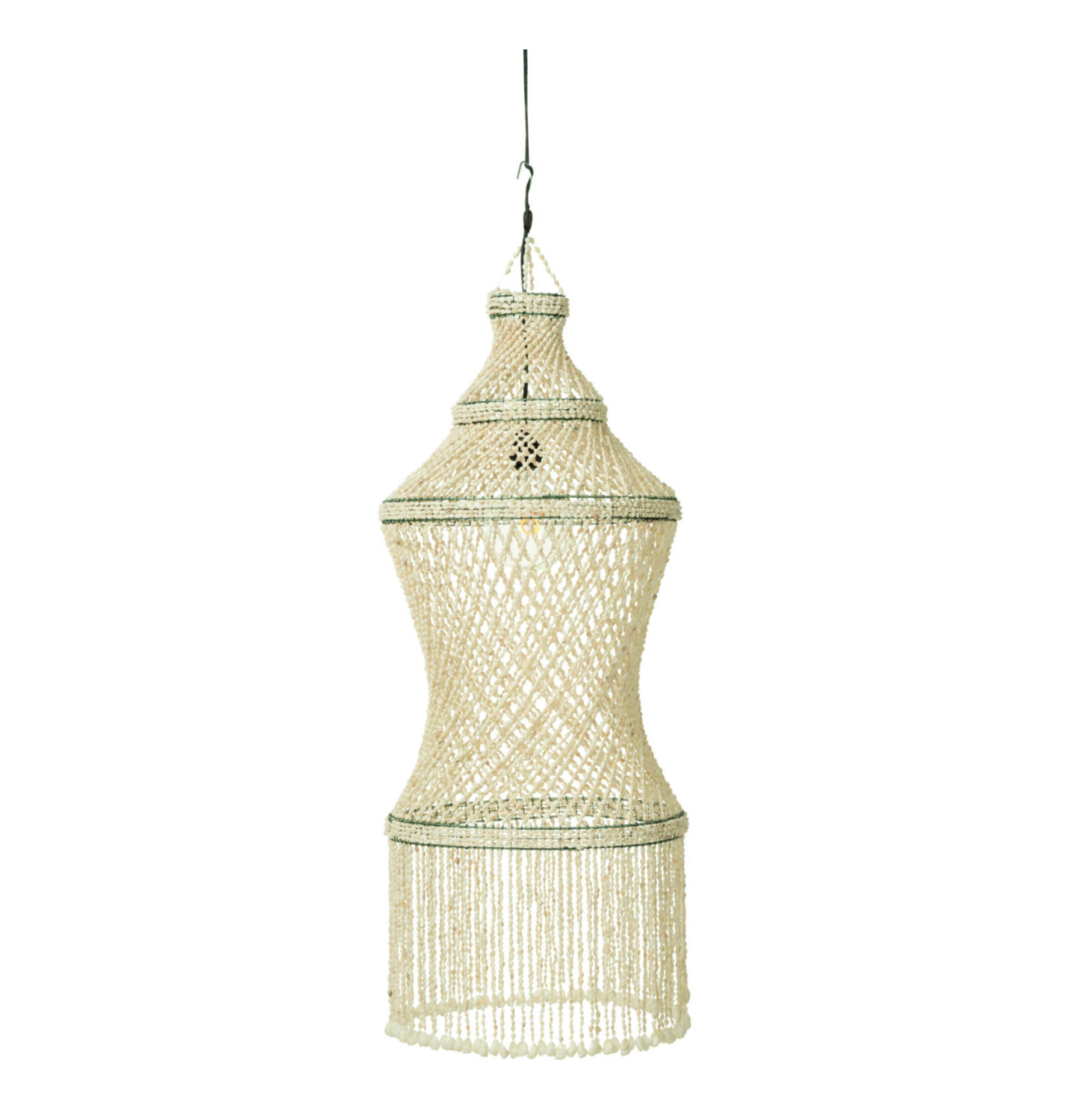 Lámpara techo conchas naturales de 170 cm, ideal para dar un toque bohemio y elegante. Luz cálida, estilo artesanal y materiales sostenibles.