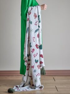Manta navideña Yule de algodón reciclado con motivos festivos y borlas verdes en las esquinas. Suave, cálida y acogedora. Perfecta para Navidad.