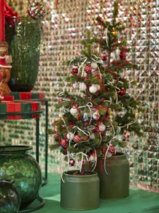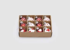Caja con 12 mini bolas navideñas de 3 cm con diseños de corazones, lunares y rayas. En tonos rojos y blancos. Perfectas para decorar árboles pequeños.