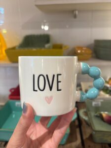 Mug de porcelana LOVE con asa azul estilo burbuja. Diseño romántico con mensaje y corazón. Ideal para regalar o disfrutar cada café con amor.