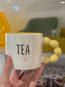 Mug de porcelana TEA con asa amarilla burbuja y corazón rosa. Diseño alegre y delicado, ideal para infusiones o como regalo especial.