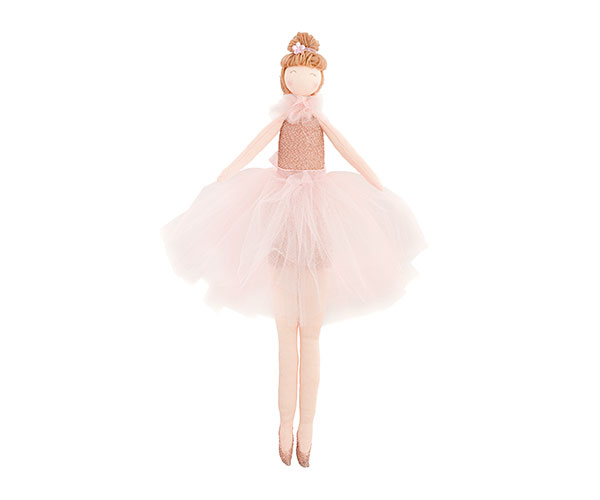 Muñeca bailarina de tul rosa, ideal para colgar o decorar estantes. Aporta un aire delicado y romántico a cualquier espacio infantil o festivo. Mide 25 cm.