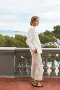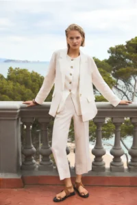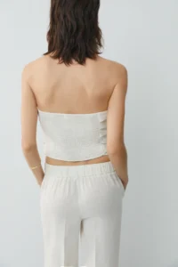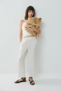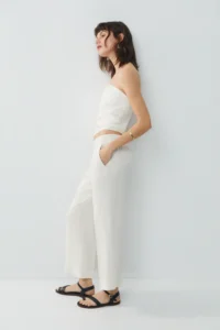 Pantalón largo en color crudo. Tejido 100% lino. Tiro medio. Cinturilla goma elástica. Bolsillos laterales. Fitting recto. Largo prenda para talla S: 95 cm.