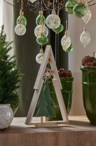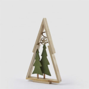 Figura decorativa de pino en madera de 54 cm de altura, con diseño rústico y detalles en verde. Ideal para añadir un toque natural y acogedor a la decoración navideña.