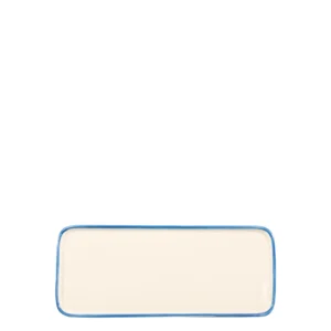 Plato cerámica liso con borde azul, hecho a mano. Estilo minimalista y elegante, perfecto para tapas, sushi o postres.
