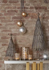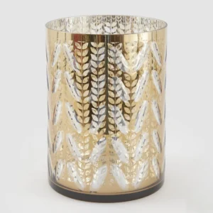 Portavelas grande cristal con acabado dorado y hojas espejo. Altura 24 cm y profundidad 18 cm. Perfecto como pieza decorativa o combinado con su versión pequeña.