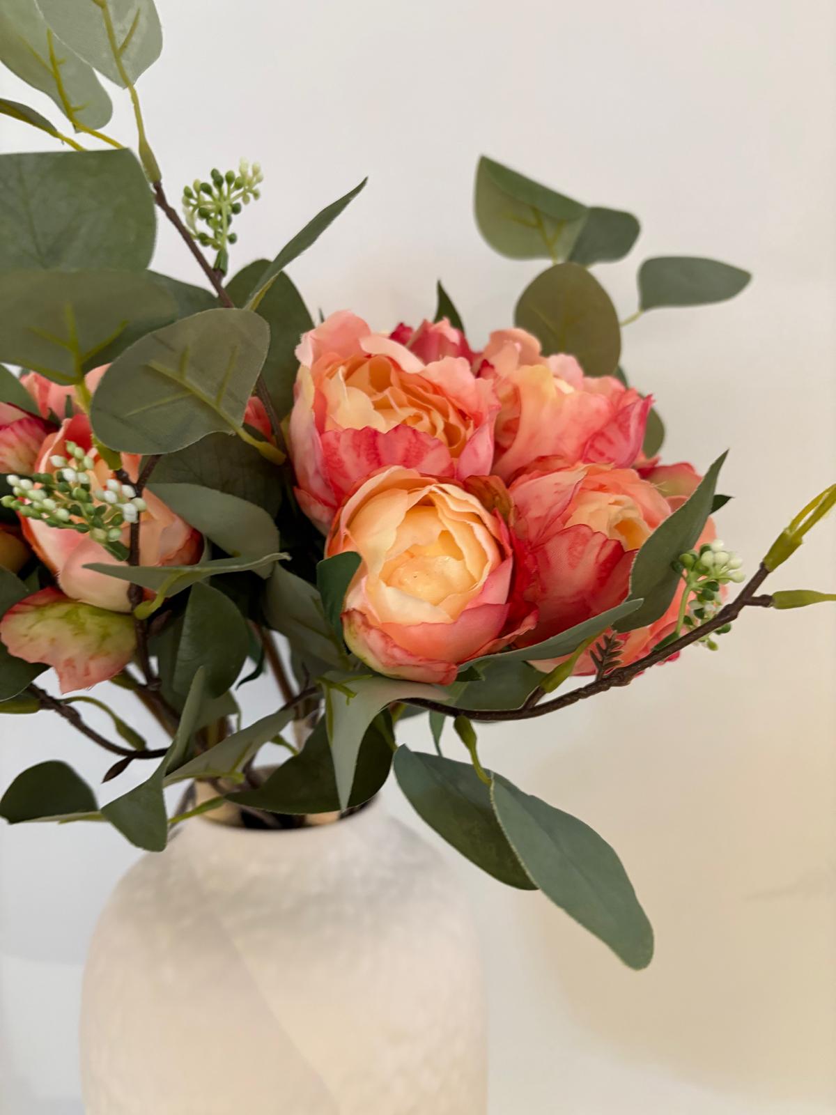 Ramo eucalipto artificial con flor. Diseño realista, sin mantenimiento, perfecto para jarrones, centros de mesa o decoración natural en el hogar.