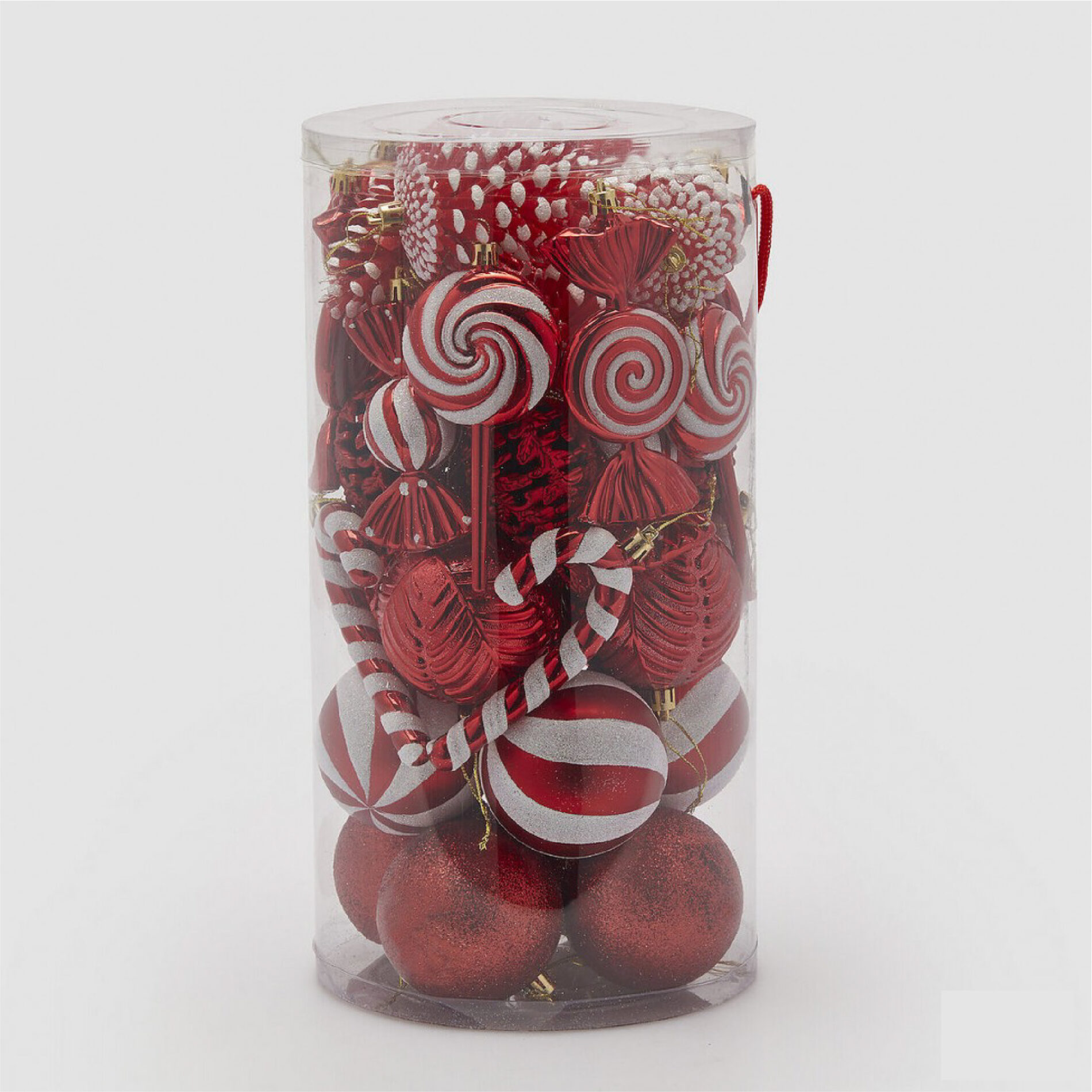 Set de 40 piezas de adornos navideños en rojo y blanco con diseños de caramelos, espirales y bolas. Perfectos para añadir un toque alegre y festivo a tu árbol o decoración.