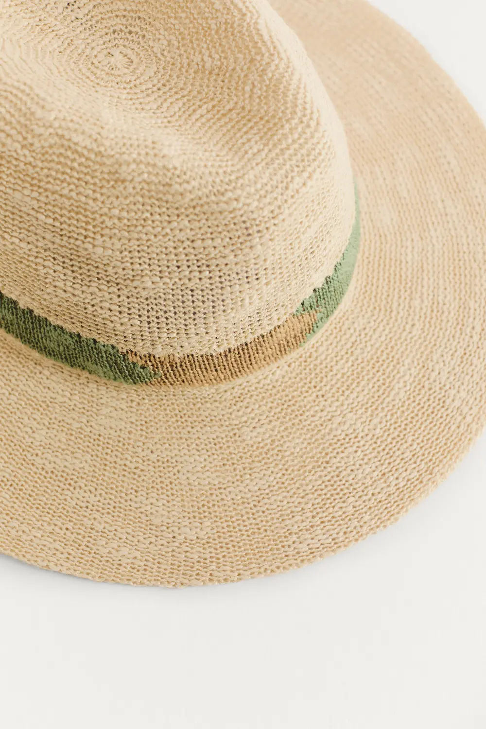 Sombrero ala ancha en tono natural con cinta tejida verde y tostado. Protección solar con diseño artesanal, perfecto para looks veraniegos.