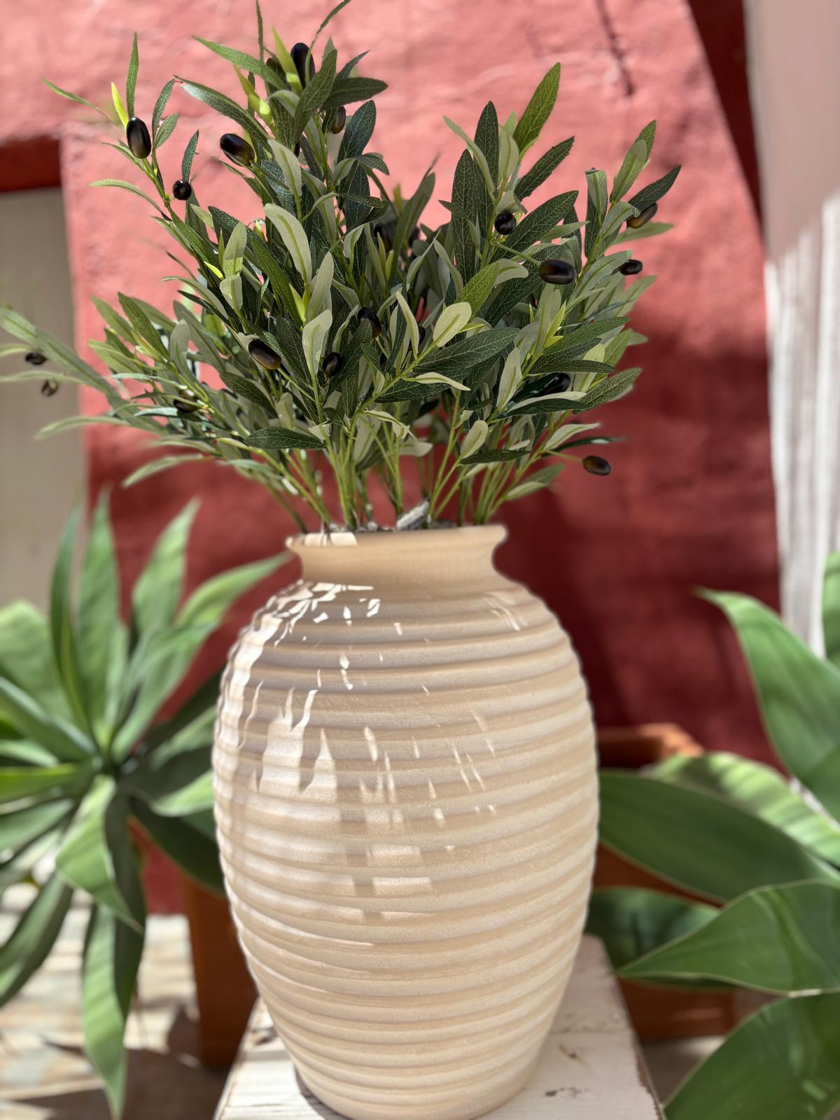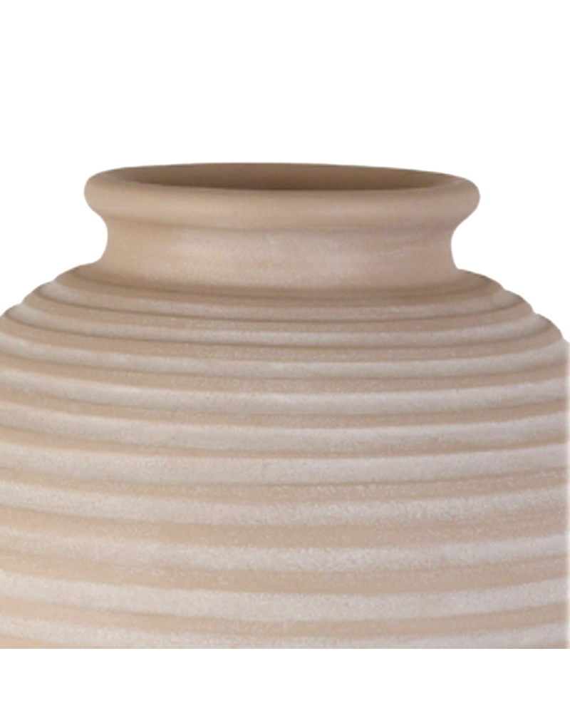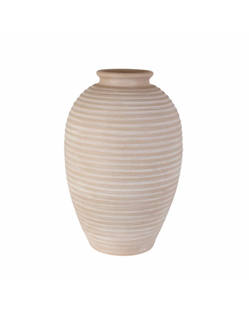Tinaja decorativa beige de cerámica con textura estriada. Diseño atemporal para decorar con elegancia cualquier rincón del hogar. Medidas: 35×50 cm.
