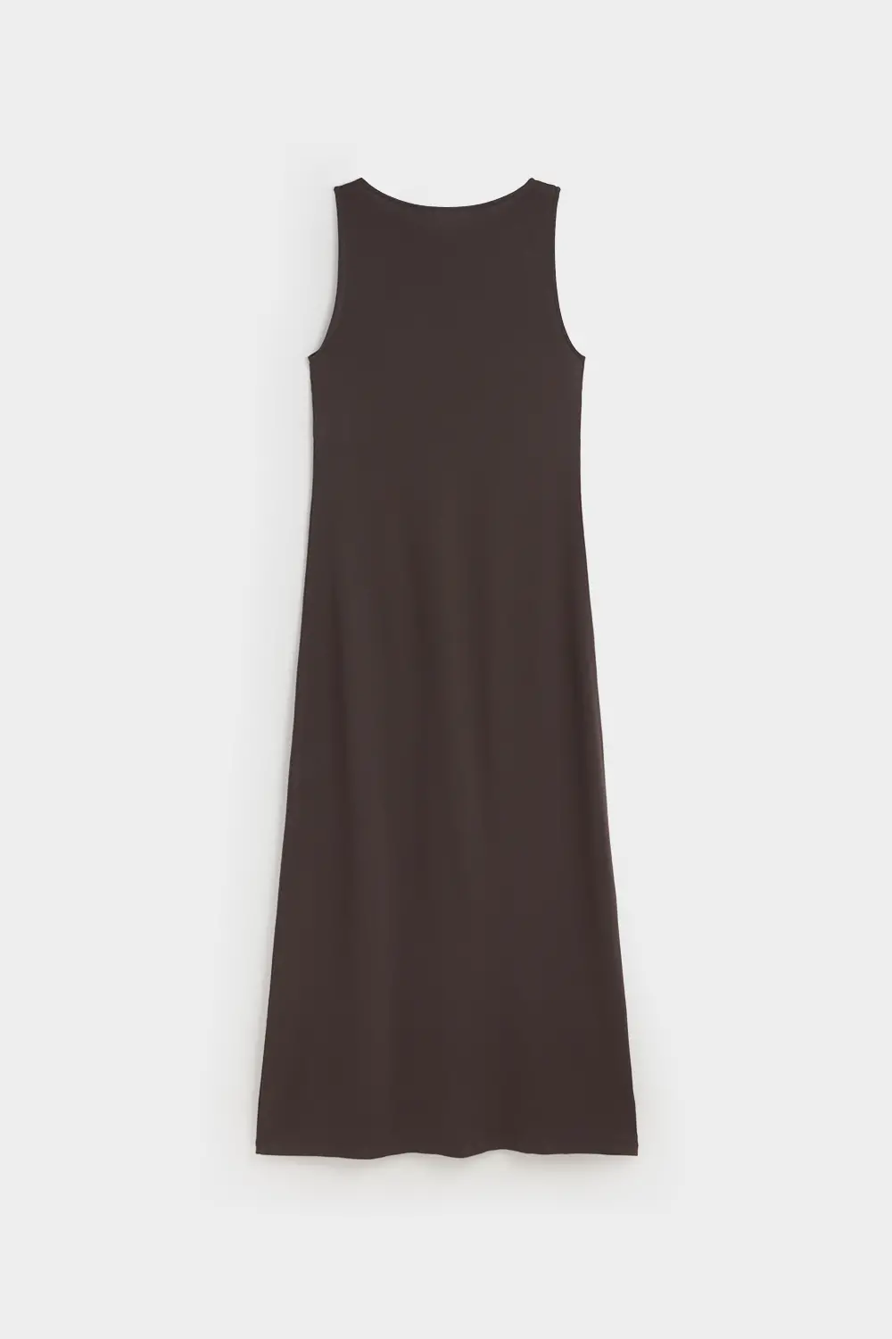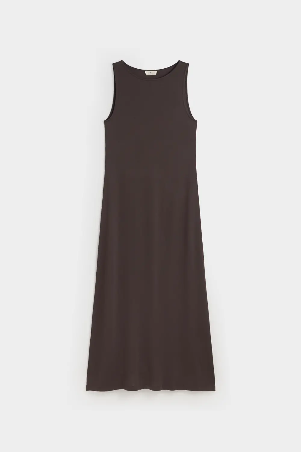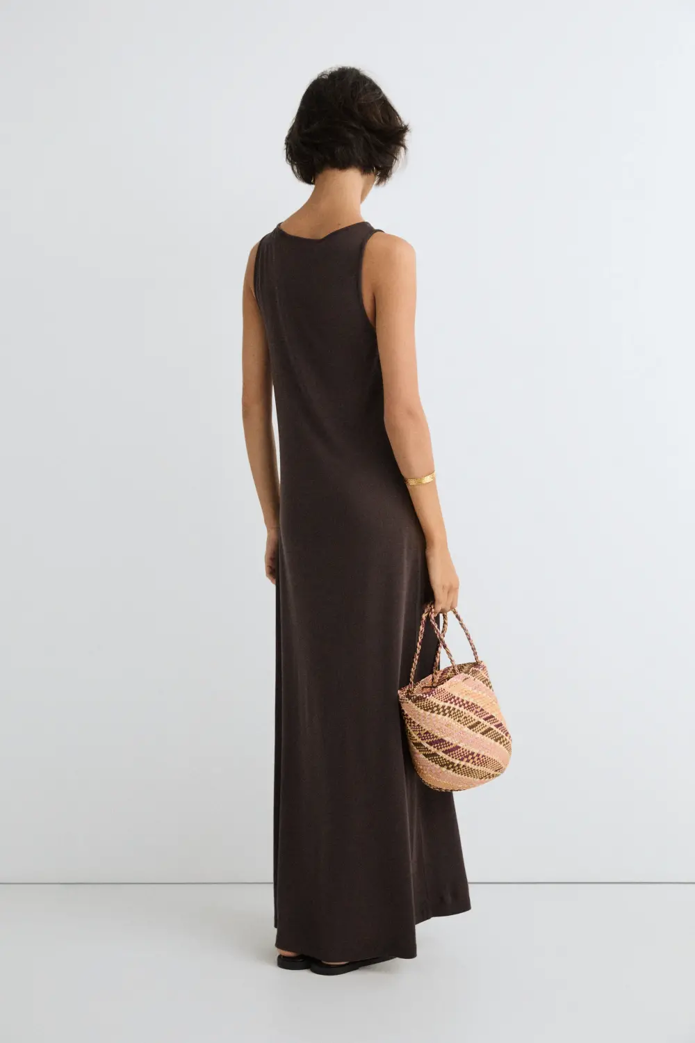 Vestido largo fluido. Hecho en Portugal. Tejido 100% lyocell, ligeramente transparente. Cuello redondo. Sin mangas. Sin cierre. Sin forro. Fitting evasé. Largo prenda para talla S: 122 cm.