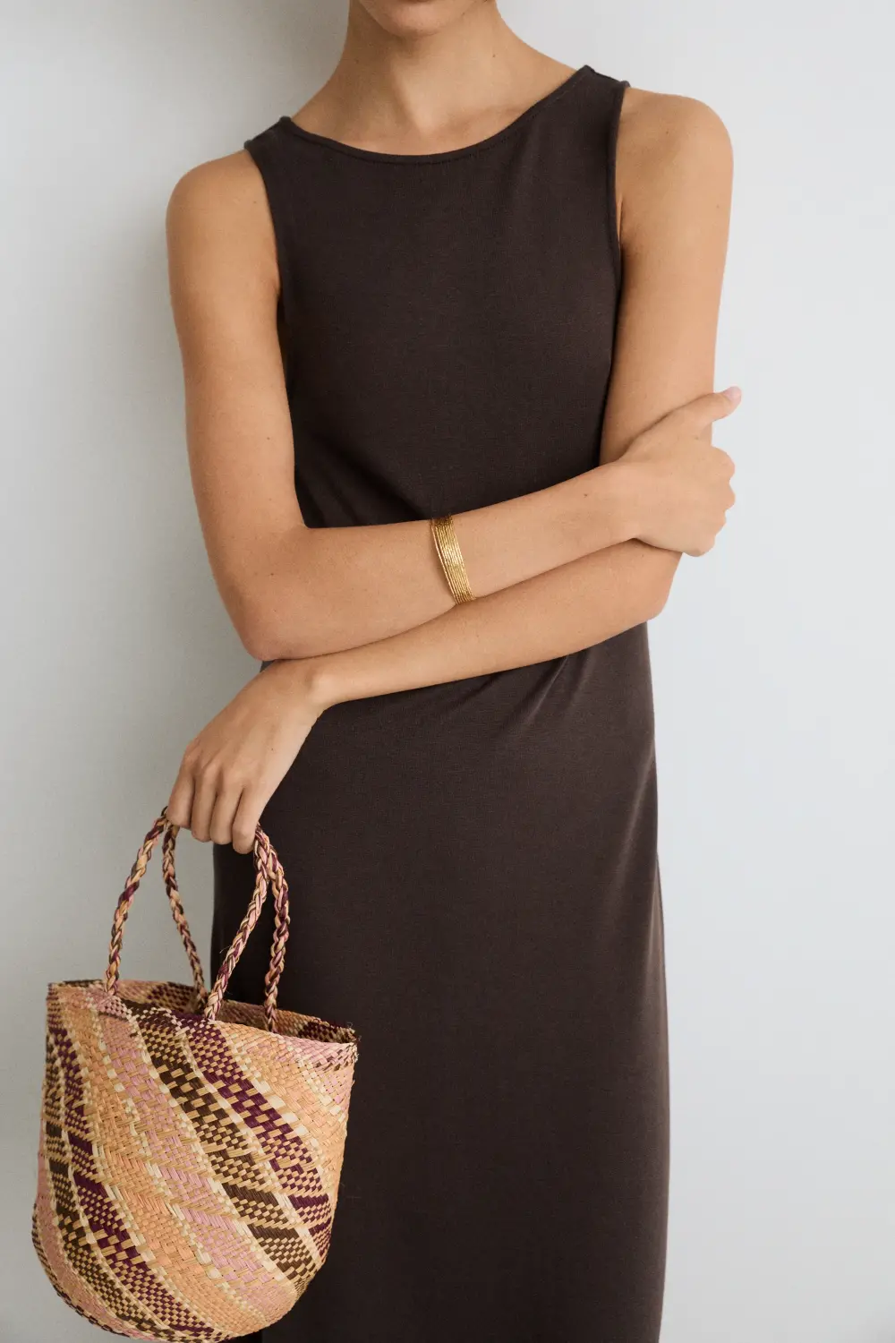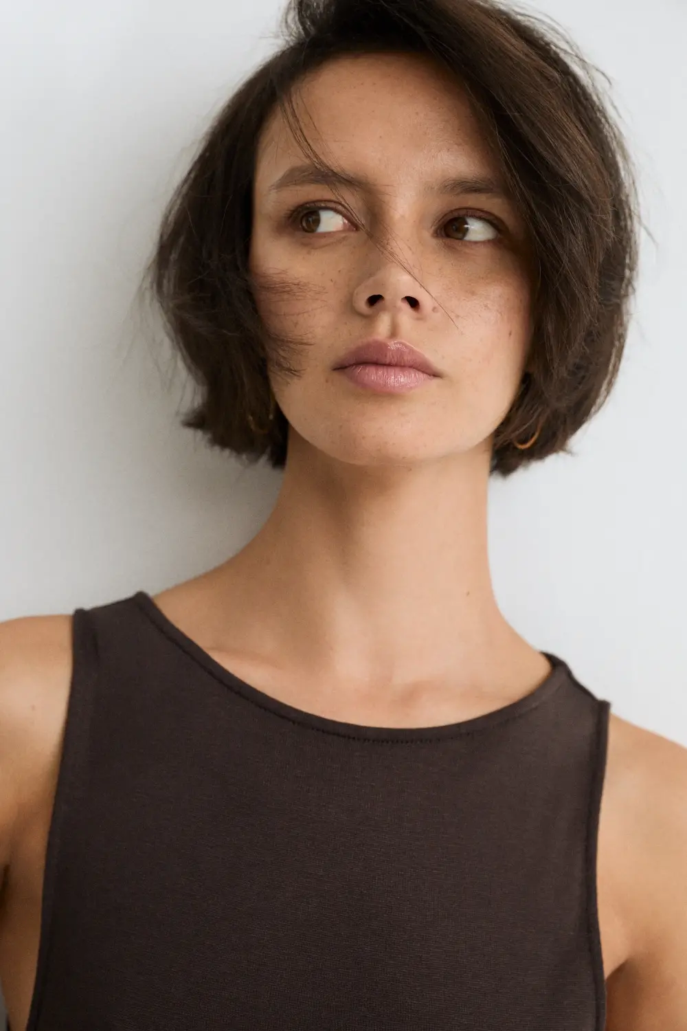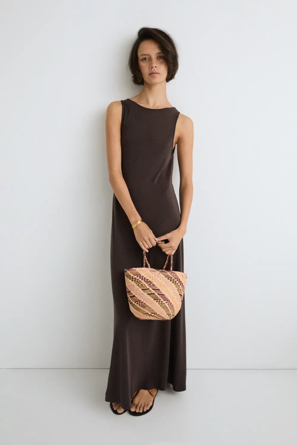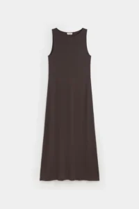 Vestido largo fluido. Hecho en Portugal. Tejido 100% lyocell, ligeramente transparente. Cuello redondo. Sin mangas. Sin cierre. Sin forro. Fitting evasé. Largo prenda para talla S: 122 cm.